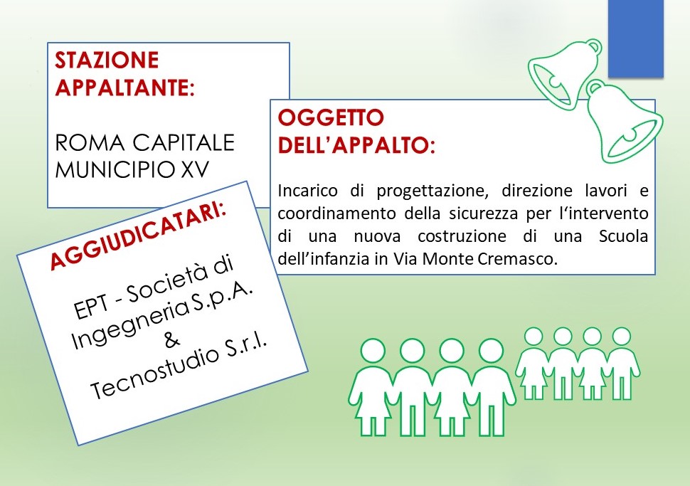 EPT Società di Ingegneria (www.ept.ingegneria.it) e Tecnostudio (www.tecnostudio.pd.it) si sono aggiudicate in RTI la gara indetta dal Municipio XV di Roma: